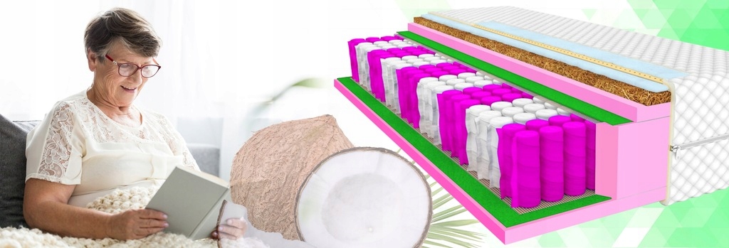 Luksusowy materac dla seniorów o bardzo wyważonym stopniu twardości, nie jest ani zbyt twardy ani zbyt miękki, bardzo chwalony i doceniany model przez naszych klientów, posiada wytrzymałe sprężyny w formatkach kieszeniowych zapewniające strefy podparcia dla całego ciała. Nasz materac pozwala wypocząć podczas snu, jest to niesamowita alternatywa dla osób poszukujących głębokiego i wygodnego snu. Model szczególnie polecany dla seniorów lub osób prowadzących siedzący tryb życia z uwagi na zastosowanie warstwy kokosowej, która mocno podnosi komfort użytkowania.