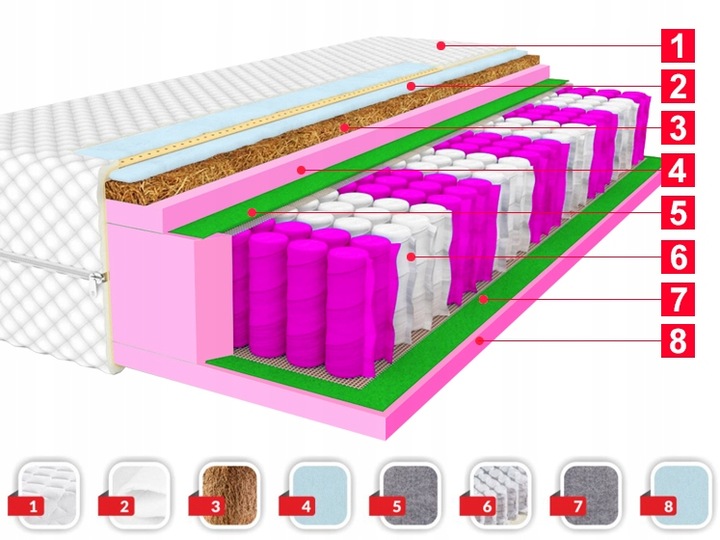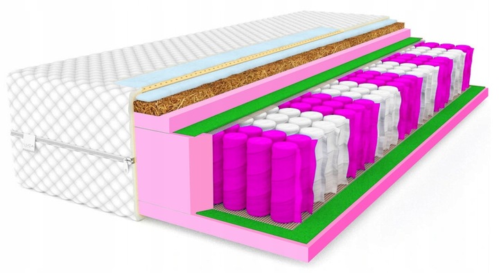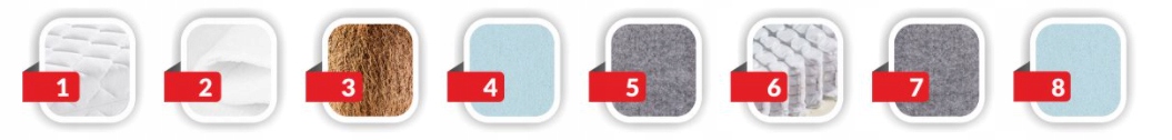 Skład: Pokrowiec Prestige, Włókno klimatyzujące, Wkład kokosowy, Pianka Poliuretanowa PRO, przekładka tapicerska, sprężyny kieszeniowe